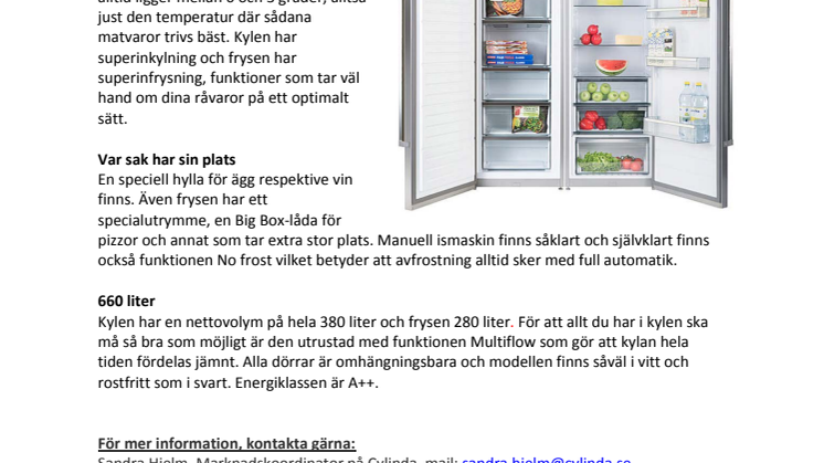 Kylen har en nettovolym på hela 380 liter och frysen 280 liter. För att allt du har i kylen ska må så bra som möjligt är den utrustad med funktionen Multiflow som gör att kylan hela tiden fördelas jämnt. Alla dörrar är omhängningsbara och modellen finns såväl i vitt och rostfritt som i svart. Energiklassen är A++.