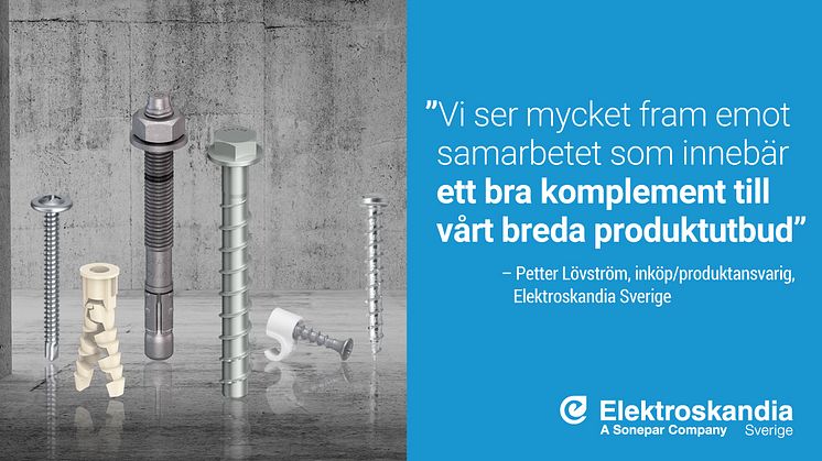 - Vi har saknat en helhetslösning då det gäller utbudet av den skruv, spik och övrig fästmateriel som våra kunder har behov av. I och med samarbetet med EJOT kan vi nu erbjuda ett brett sortiment som täcker de flesta behoven. I våra butiker kommer vi ha tre till fyra hyllsektioner med EJOT-produkter för olika material så som trä och skivmaterial, betong och metall. Totalt kommer cirka 500 artiklar att finnas på vår webb och ungefär 130 artiklar i våra butiker. Vi ser mycket fram emot samarbetet som innebär ett bra komplement till vårt breda produktutbud, säger Petter Lövström, inköp/produktansvarig Elektroskandia Sverige AB.