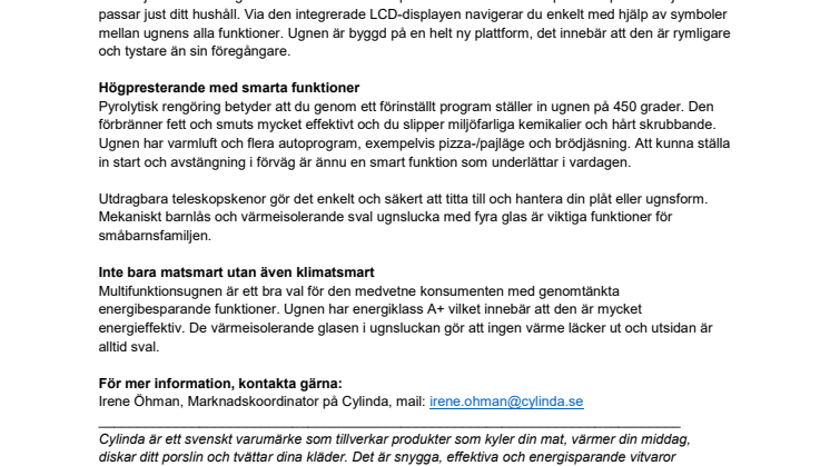 Att välja vitvaror handlar för dagens medvetna konsumenter om att en rad kriterier ska vara uppfyllda. Utöver funktion, design och pris är även klimatpåverkan en viktig faktor. Det har vi på Cylinda tagit fasta på och lanserar nu en självrengörande multifunktionsugn med energinivå A+ – IBU 94 P RFS.