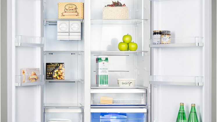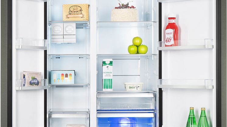Med god LED-belysning i sidorna får du bra överblick över alla livsmedel, oavsett var i skåpet de är placerade. Genom blått ljus i en av kylens lådor håller du grönsakerna fina och fräscha längre.
