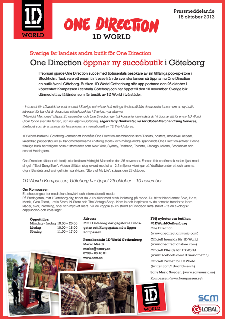 I februari gjorde One Direction succé med tiotusentals besökare av sin tillfälliga pop-up-store i Stockholm. Tack vare ett enormt intresse från de svenska fansen så öppnar nu One Direction en butik även i Göteborg. Butiken 1D World Gothenburg slår upp portarna den 26 oktober i köpcentrat Kompassen i centrala Göteborg och har öppet till den 10 november.