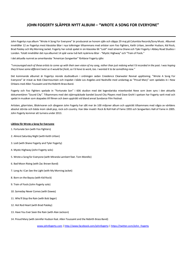 John Fogertys nya album ”Wrote A Song For Everyone” är producerat av honom själv och släpps 29 maj på Columbia Records/Sony Music. Albumet innehåller 12 av Fogertys mest klassiska låtar i nya tolkningar tillsammans med artister som Foo Fighters, Keith Urban, Jennifer Hudson, Kid Rock, Brad Paisley och My Morning Jacket. Fogerty har också spelat in sin klassiska låt “Lodi” med sönerna Shane och Tyler Fogerty i Abbey Road Studios i London. Totalt innehåller det nya albumet 14 spår varav två helt nyskrivna låtar - “Mystic Highway” och “Train of Fools.”