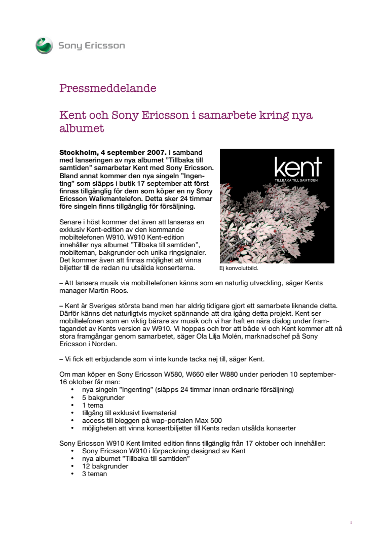 – Kent är Sveriges största band men har aldrig tidigare gjort ett samarbete liknande detta. Därför känns det naturligtvis mycket spännande att dra igång detta projekt. Kent ser mobiltelefonen som en viktig bärare av musik och vi har haft en nära dialog under framtagandet av Kents version av W910. Vi hoppas och tror att både vi och Kent kommer att nå stora framgångar genom samarbetet, säger Ola Lilja Molén, marknadschef på Sony Ericsson i Norden.