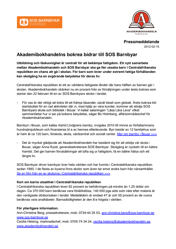 Centralafrikanska republiken är ett av världens fattigaste länder. Akademibokhandeln skänker en procent från av försäljningen under årets bokrea till en av SOS Barnbyars skolor i landet.