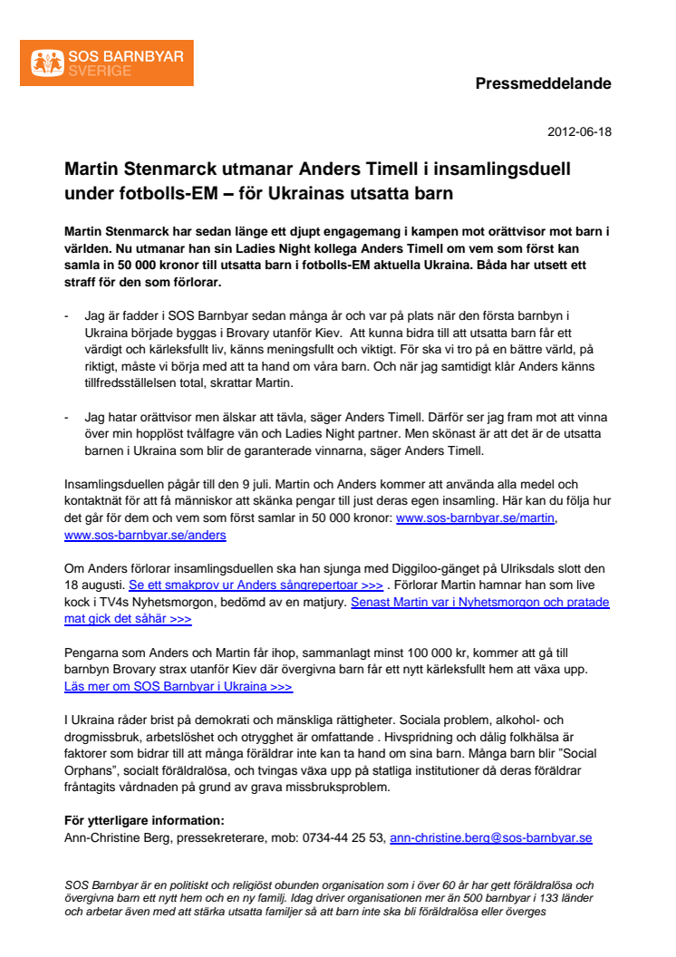 Martin Stenmarck har sedan länge ett djupt engagemang i kampen mot orättvisor mot barn i världen. Nu utmanar han sin Ladies Night kollega Anders Timell om vem som först kan samla in 50 000 kronor till utsatta barn i fotbolls-EM aktuella Ukraina. Båda har utsett ett straff för den som förlorar.