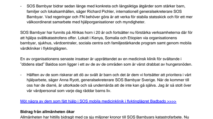 - Hälften av de som riskerar att dö av svält är barn och det är dem vi fortsätter att prioritera i vårt hjälparbete, säger Anna Ryott, generalsekreterare SOS Barnbyar Sverige. När de kommer till oss har de diarré, är uttorkade och så undernärda att de inte kan gå själva. Jag är så stolt över vår vårdpersonal som varje dag räddar barns liv.