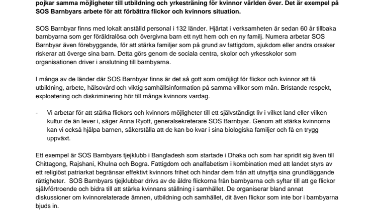 - Att stärka fattiga och utsatta kvinnor är avgörande för att vi ska nå målet att minska antalet barn som överges eller blir föräldralösa, säger Anna Ryott, generalsekreterare SOS Barnbyar. Att satsa på kvinnor har visat sig mycket effektivt då det både stärker den enskilda familjen och bidrar en hållbar positiv samhällsutveckling.