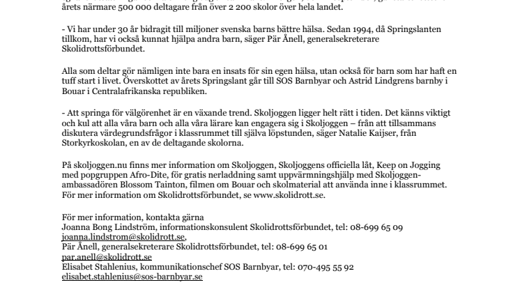 Skoljoggen arrangeras varje höst av Skolidrottsförbundet i en stor del av Sveriges skolor. Förra året deltog 490 000 elever. I samband med Skoljoggen samlas en frivillig Springslant in bland elever, skolpersonal och föräldrar till en förmånstagare och Skolidrottsförbundet. Åren 2012-2016 är SOS Barnbyar förmånstagare.