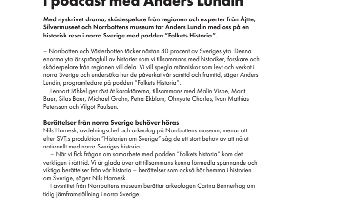 – Norrbotten och Västerbotten täcker nästan 40 procent av Sveriges yta. Denna enorma yta är sprängfull av historier som vi tillsammans med historiker, forskare och skådespelare från regionen vill dela. Vi vill spegla människor som levt och verkat i norra Sverige och undersöka hur de påverkat vår samtid och framtid, säger Anders Lundin, programledare på podden ”Folkets Historia”.