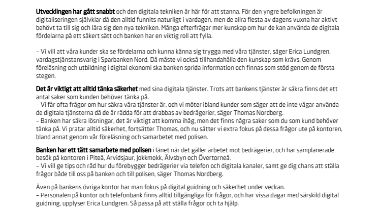 – Vi vill att våra kunder ska se fördelarna och kunna känna sig trygga med våra tjänster, säger Erica Lundgren, vardagstjänstansvarig i Sparbanken Nord. Då måste vi också tillhandahålla den kunskap som krävs. Genom föreläsning och utbildning i digital ekonomi ska banken sprida information och finnas som stöd genom de första stegen.