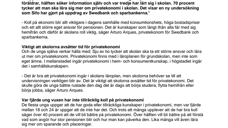 Knappt sex av tio mellan 18 och 24 år har lärt sig om privatekonomi av sina föräldrar, hälften söker information själv och var tredje har lärt sig i skolan. Hela 70 procent tycker att man ska lära sig mer om privatekonomi i skolan. Det visar en ny undersökning som Sifo gjort på uppdrag av Sparbankerna och Swedbank.1