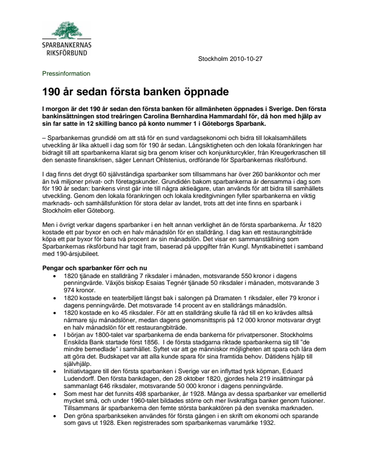 I morgon är det 190 år sedan den första banken för allmänheten öppnades i Sverige. Fram till 1820 hade bankerna mest varit för affärsmän och förmögna.