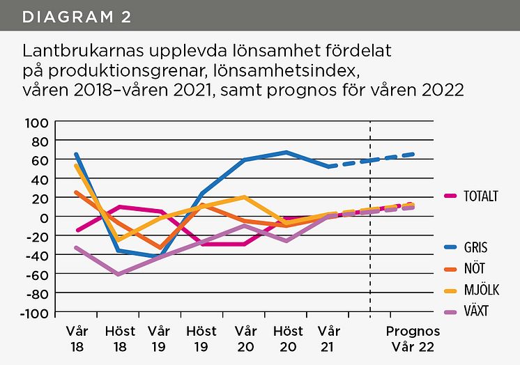 Lantbrukarnas upplevda lönsamhet fördelat på produktionsgrenar, lönsamhetsindex, våren 2018-våren 2021, samt prognos för våren 2022.