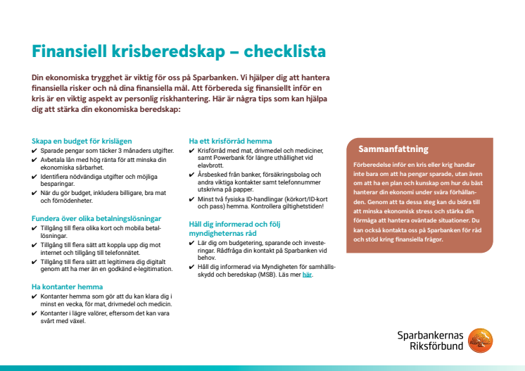 Om undersökningen Finansiell krisberedskap – allmänhetens syn: Undersökningen genomfördes av undersökningsföretaget 3S på uppdrag av Sparbankernas Riksförbund. Undersökningen gjordes i certifierade webbpaneler i ett representativt slumpmässigt urval av svenskar i åldern 18–80 år och antalet svarande var 1037 personer. Undersökningen genomfördes 15–23 november 2023.