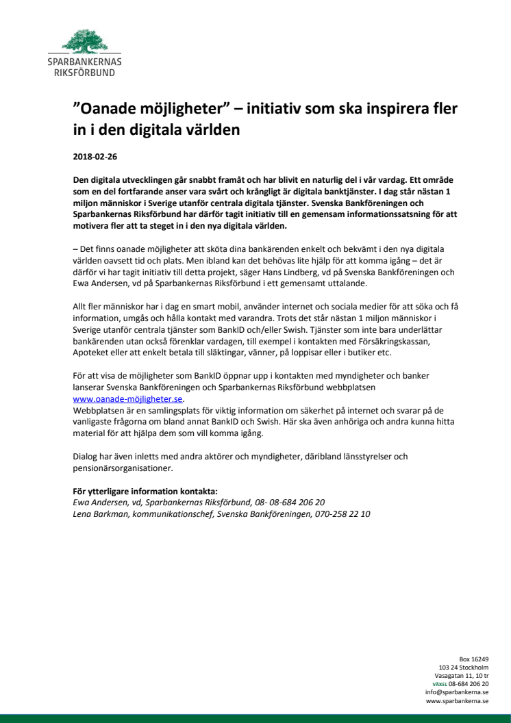 Den digitala utvecklingen går snabbt framåt och har blivit en naturlig del i vår vardag. Ett område som en del fortfarande anser vara svårt och krångligt är digitala banktjänster. I dag står nästan 1 miljon människor i Sverige utanför centrala digitala tjänster. Svenska Bankföreningen och Sparbankernas Riksförbund har därför tagit initiativ till en gemensam informationssatsning för att motivera fler att ta steget in i den nya digitala världen.