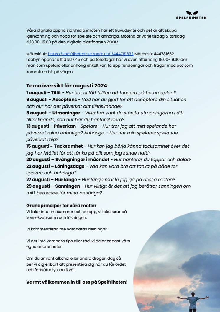 Temaöverisk augusti 2024 självhjälpsmöten på Spelfriheten