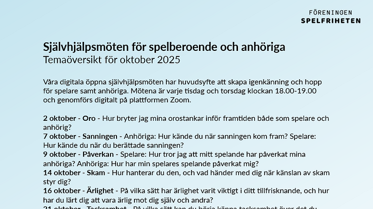 • Temaöversikt för Spelfrihetens självhjälpsmöten i oktober.