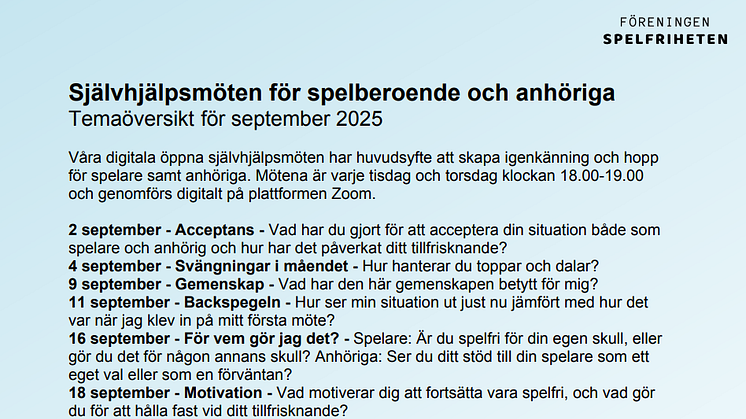 • Temaöversikt för Spelfrihetens självhjälpsmöten i september.