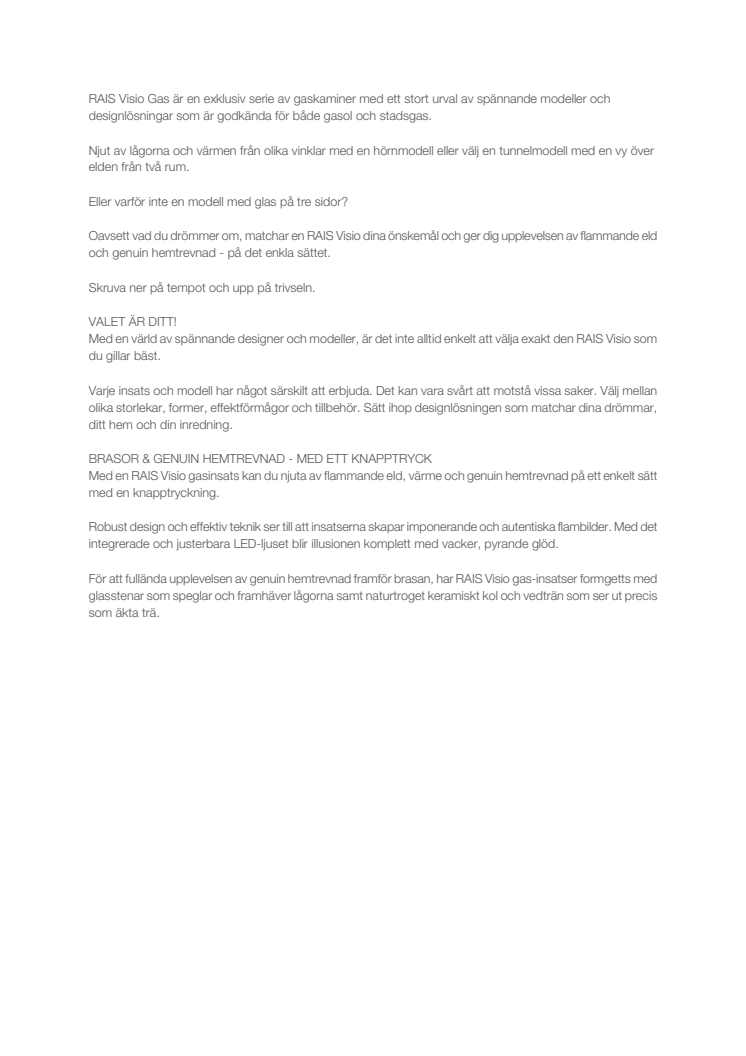 RAIS Visio Gas är en exklusiv serie av gaskaminer med ett stort urval av spännande modeller och designlösningar som är godkända för både gasol och stadsgas. Njut av lågorna och värmen från olika vinklar med en hörnmodell eller välj en tunnelmodell med en vy över elden från två rum. Eller varför inte en modell med glas på tre sidor?