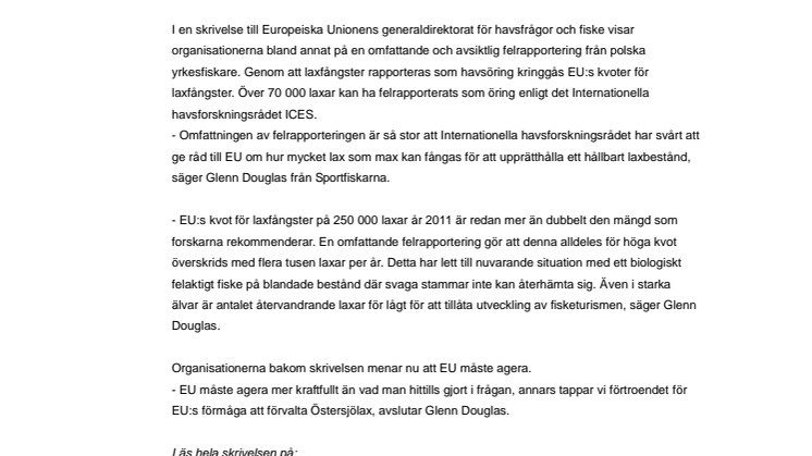 I en skrivelse till Europeiska Unionens generaldirektorat för havsfrågor och fiske visar organisationerna bland annat på en omfattande och avsiktlig felrapportering från polska yrkesfiskare. Genom att laxfångster rapporteras som havsöring kringgås EU:s kvoter för laxfångster. Över 70 000 laxar kan ha felrapporterats som öring enligt det Internationella havsforskningsrådet ICES.
