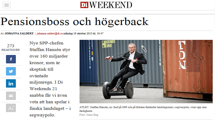Staffan Hansén styr över 160 miljarder kronor, men är skeptisk till oväntade miljonregn. I Di Weekends 21 snabba får vi även veta att han spelar i finska landslaget – i segwaypolo. Läs hela intervjun på di.se