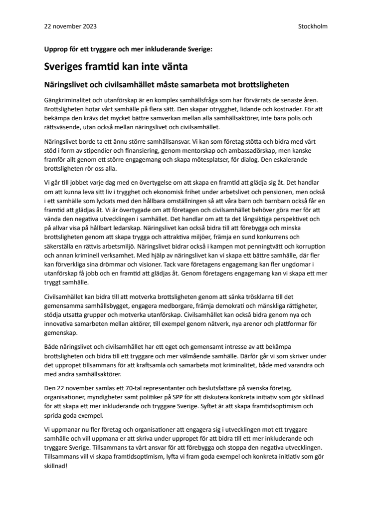Jenny Rundbladh, vd för SPP beskriver uppropet: ”Jag vill uppmana företagsledare att tillsammans med mig och SPP kraftsamla för att motverka den negativa samhällsutvecklingen och bidra till innovation och hållbart ledarskap i Sverige framåt. Jag har initierat ett upprop för ett tryggare och mer inkluderande Sverige och jag hoppas att fler företag ställer sig bakom det ”.