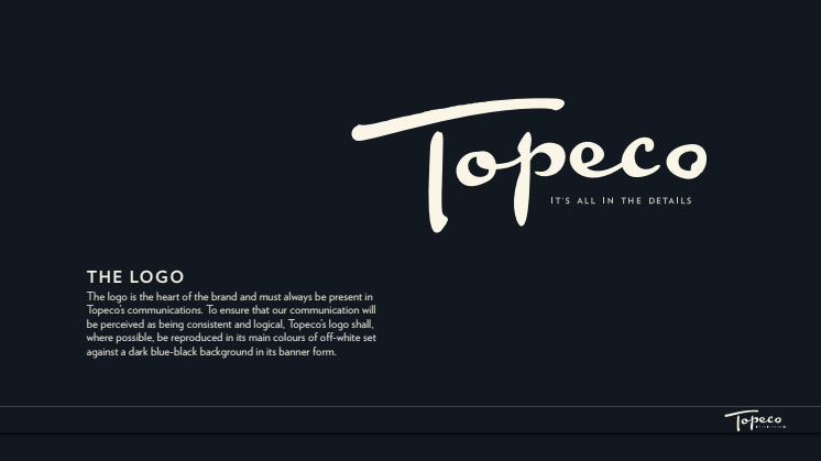 The Logo is the heart of the brand and must always be present in Topeco´s communications. To ensure that our communication will be percevied as being consistent and logical, Topeco´s logo shall, where possible, be reproduced in its main colours of off-white set against a dark blue-black background in its banner form.
