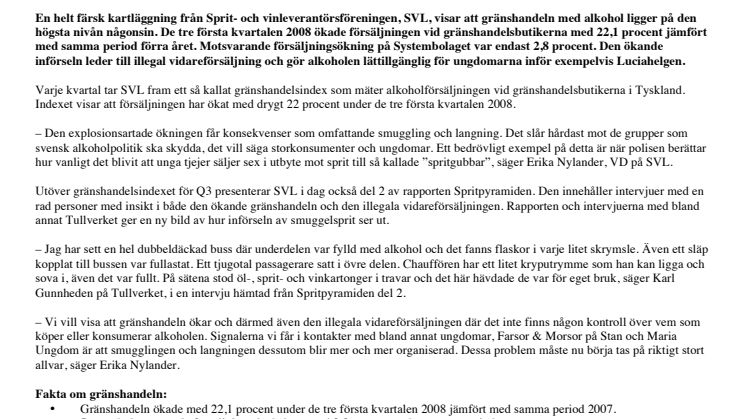 En helt färsk kartläggning från Sprit- och vinleverantörsföreningen, SVL, visar att gränshandeln med alkohol ligger på den högsta nivån någonsin. De tre första kvartalen 2008 ökade försäljningen vid gränshandelsbutikerna med 22,1 procent jämfört med samma period förra året. Motsvarande försäljningsökning på Systembolaget var endast 2,8 procent. Den ökande införseln leder till illegal vidareförsäljning och gör alkoholen lättillgänglig för ungdomarna inför exempelvis Luciahelgen.