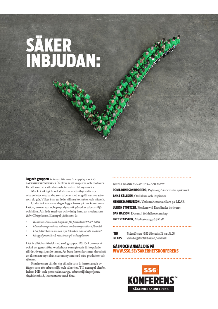 SSG Säkerhetskonferens är ett årligt och uppskattat inslag i Sverige inom arbetsmiljö och arbetssäkerhet. Den 25-26 mars anordnas SSG Säkerhetskonferens för nionde gången och för andra året i rad på Hotell Södra Berget i Sundsvall. Årets tema är ”Jag och gruppen”. Välkommen att bli inspirerad att ta arbetsmiljöarbetet till nya nivåer.