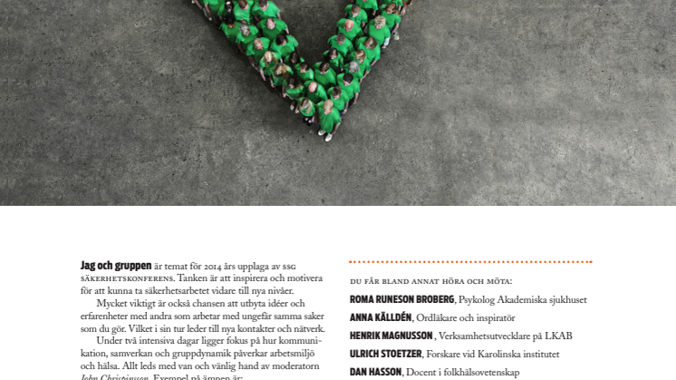 SSG Säkerhetskonferens är ett årligt och uppskattat inslag i Sverige inom arbetsmiljö och arbetssäkerhet. Den 25-26 mars anordnas SSG Säkerhetskonferens på Hotell Södra Berget i Sundsvall. Årets tema är ”Jag och gruppen”.