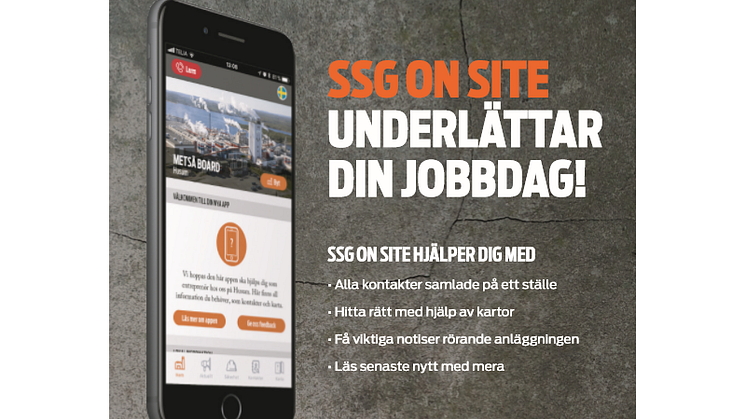 SSG On site är en app för anläggningsinformation och innehåller information om kontakter, larmnummer, kartor och annat viktigt som man behöver veta när man som entreprenör besöker en anläggning. SSG On site testades för första gången under oktober 2017 när Metsä Board Husum hade ett driftstopp, och rönte då stor uppmärksamhet.