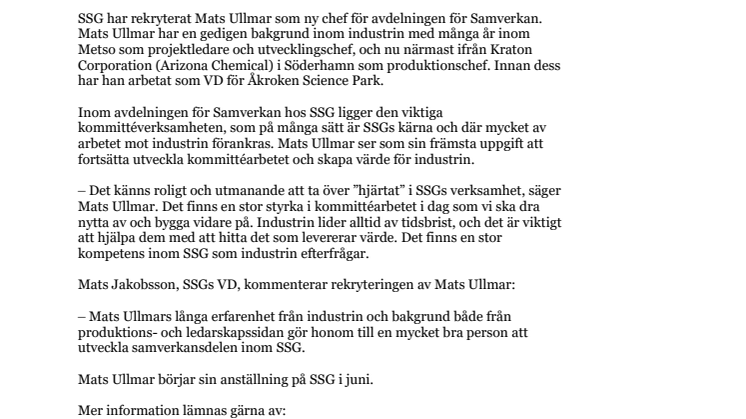 SSG har rekryterat Mats Ullmar som ny chef för avdelningen för Samverkan. Mats kommer närmast som produktionschef på Kraton Corporation (Arizona Chemical) i Söderhamn och börjar sitt arbete på SSG i juni.