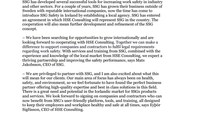 – Vi har letat efter möjligheter att växa internationellt och ser fram emot att samarbeta med HSE Consulting. Tillsammans kan vi göra skillnad för att stödja anläggningar och entreprenörer att uppfylla lagkrav gällande arbetsmiljö och säkerhetsfrågor. Med tjänster och utbildningar från SSG, kombinerat med erfarenhet och kunskap om den lokala marknaden från HSE Consulting, förväntar vi oss ett blomstrande partnerskap och säkrare arbetsmiljö på Island, säger Mats Jakobsson, VD för SSG.