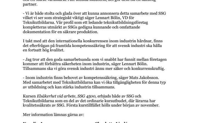 - Vi är både stolta och glada över att kunna annonsera detta samarbete med SSG vilket vi ser som strategiskt viktigt säger Lennart Bölin, VD för Teknikutbildarna. Vår profil som ett ledande teknikutbildningsföretag kompletteras utmärkt av SSGs gedigna kunnande och omfattande dokumentation för en säkrare produktion.