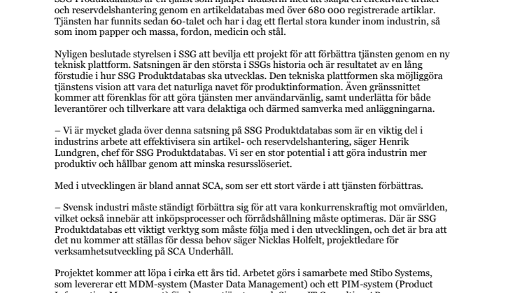 – Vi är mycket glada över denna satsning på SSG Produktdatabas som är en viktig del i industrins arbete att effektivisera sin artikel- och reservdelshantering, säger Henrik Lundgren, chef för SSG Produktdatabas. Vi ser en stor potential i att göra industrin mer produktiv och hållbar genom att minska resursslöseriet.