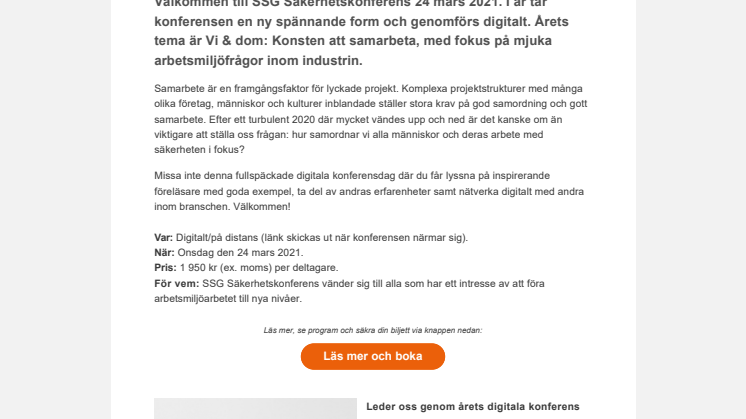 - Arbetsmiljö- och säkerhet är ämnen som många brinner för och konferensen lockar årligen deltagare verksamma inom arbetsmiljö, säkerhet, arbetarskydd och liknande. Det känns kul att vi kan erbjuda konferensen digitalt, den blir mer tillgänglig för alla och årets innehåll kommer många ha nytta av, säger Lena Wiig, Affärsområdeschef Arbetsmiljö på SSG.