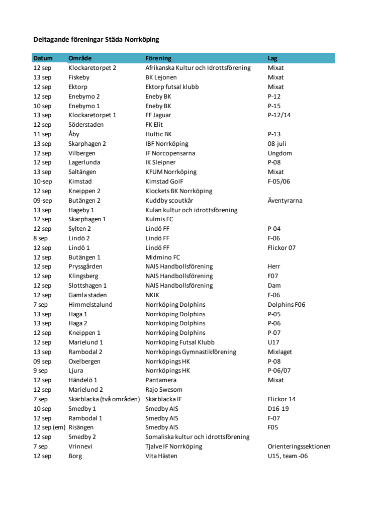 Deltagande föreningar Städa Norrköping, 7-13 september.