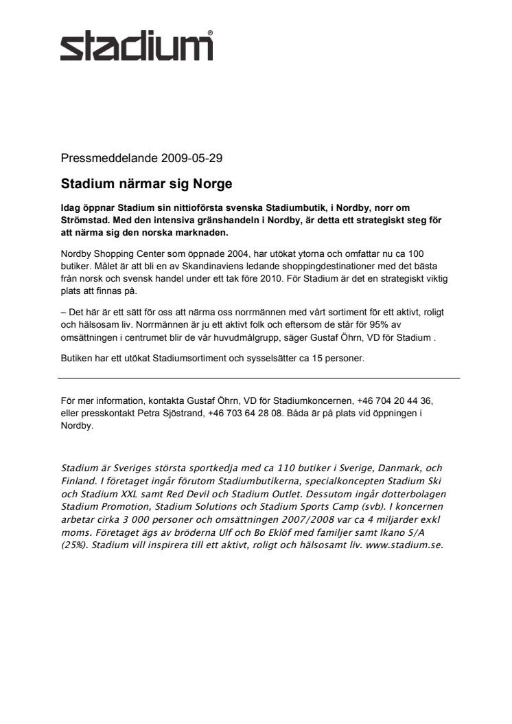 I dag öppnar Stadium sin nittioförsta svenska Stadiumbutik, i Nordby, norr om Strömstad. – Det här är ett sätt för oss att närma oss norrmännen med vårt sortiment för ett aktivt, roligt och hälsosamt liv. Norrmännen står för 95% av omsättningen i centrumet, säger Gustaf Öhrn, VD för Stadiumkoncernen. Butiken har ett utökat Stadiumsortiment och sysselsätter ca 15 personer.