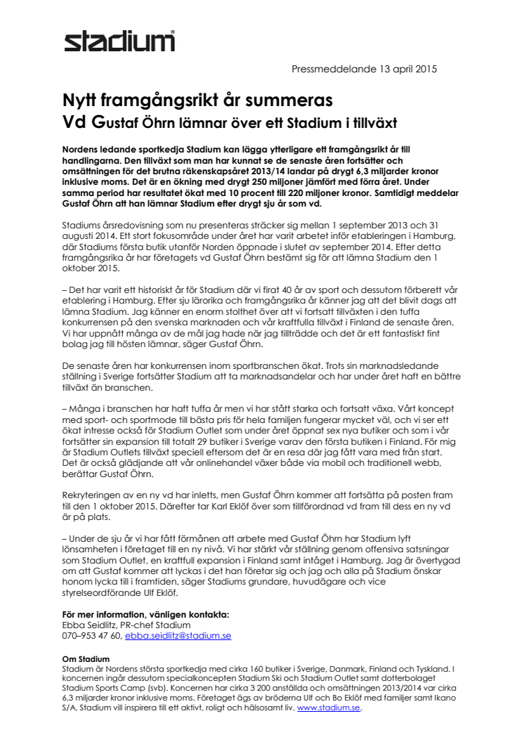 Stadiums årsredovisning som nu presenteras sträcker sig mellan 1 september 2013 och 31 augusti 2014. Ett stort fokusområde under året har varit arbetet inför etableringen i Hamburg, där Stadiums första butik utanför Norden öppnade i slutet av september 2014. Efter detta framgångsrika år har företagets vd Gustaf Öhrn bestämt sig för att lämna Stadium den 1 oktober 2015.