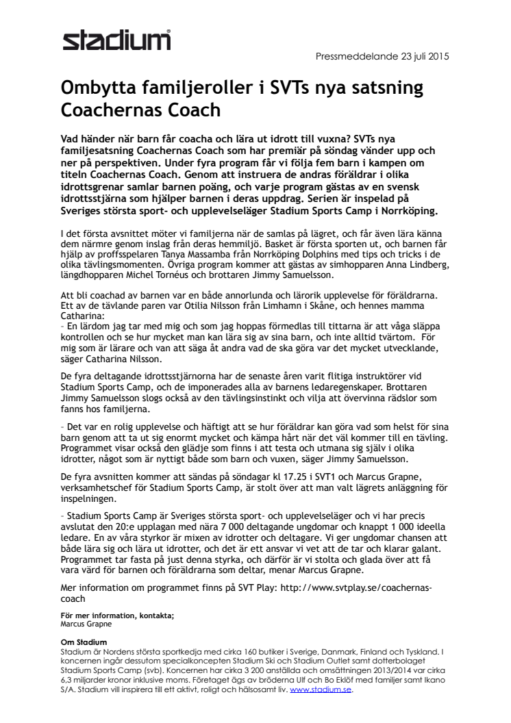 – Stadium Sports Camp är Sveriges största sport- och upplevelseläger och vi har precis avslutat den 20:e upplagan med nära 7 000 deltagande ungdomar och knappt 1 000 ideella ledare. En av våra styrkor är mixen av idrotter och deltagare. Vi ger ungdomar chansen att både lära sig och lära ut idrotter, och det är ett ansvar vi vet att de tar och klarar galant. Programmet tar fasta på just denna styrka, och därför är vi stolta och glada över att få vara värd för barnen och föräldrarna som deltar, menar Marcus Grapne.