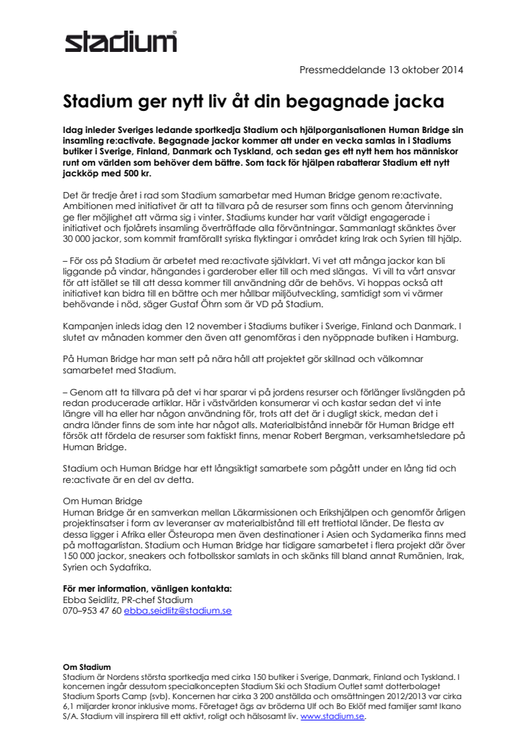 Idag inleder Sveriges ledande sportkedja Stadium och hjälporganisationen Human Bridge sin insamling re:activate. Begagnade jackor kommer att under en vecka samlas in i Stadiums butiker i Sverige, Finland, Danmark och Tyskland, och sedan ges ett nytt hem hos människor runt om världen som behöver dem bättre. Som tack för hjälpen rabatterar Stadium ett nytt jackköp med 500 kr.