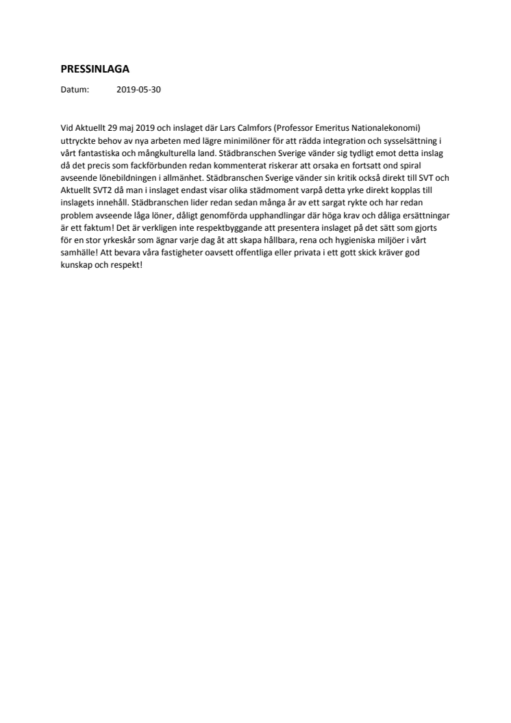 Vid Aktuellt 29 maj 2019 och inslaget där Lars Calmfors (Professor Emeritus Nationalekonomi) uttryckte behov av nya arbeten med lägre minimilöner för att rädda integration och sysselsättning i vårt fantastiska och mångkulturella land. Städbranschen Sverige vänder sig tydligt emot detta inslag