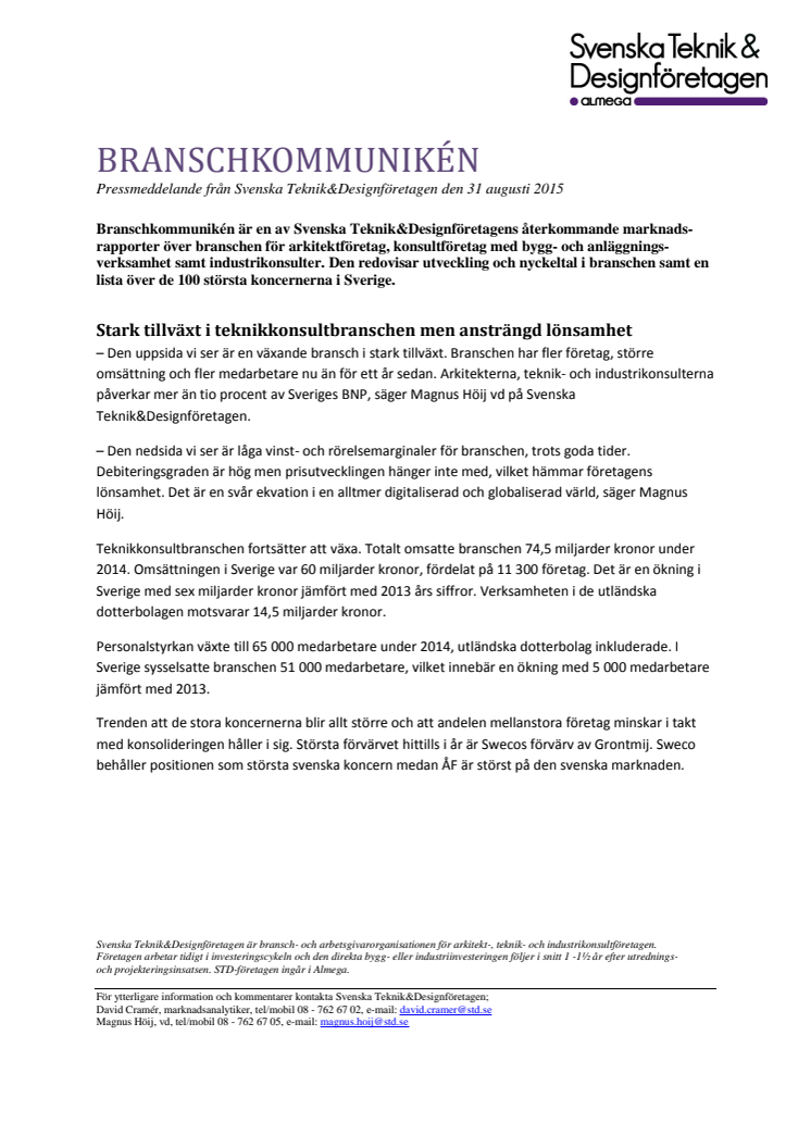 Branschkommunikén 2015: Stark tillväxt i teknikkonsultbranschen men ansträngd lönsamhet