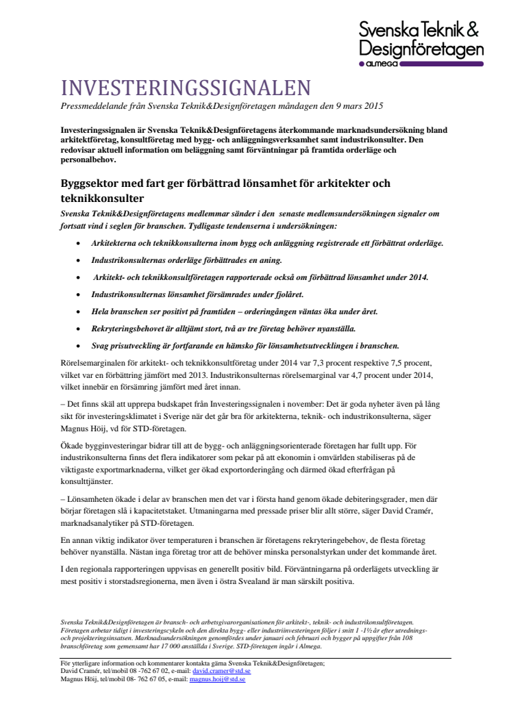Svenska Teknik&Designföretagen: Investeringssignalen, mars 2015