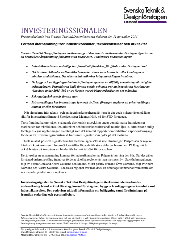 Svenska Teknik&Designföretagen: Investeringssignalen, november 2014