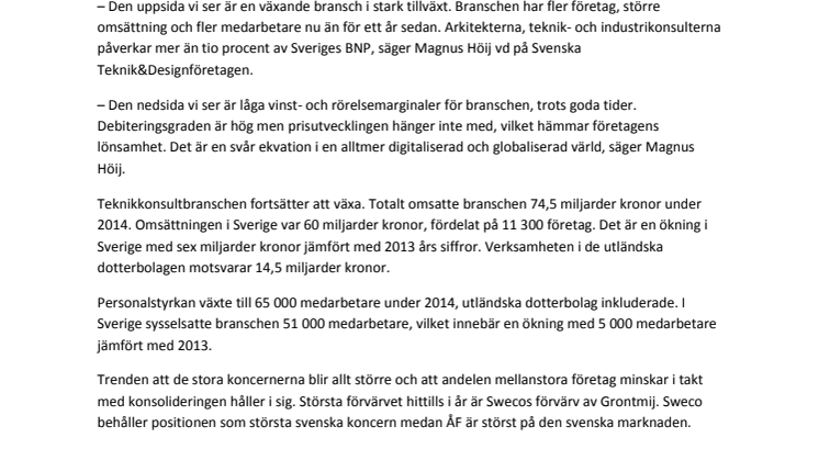 – Den uppsida vi ser är en växande bransch i stark tillväxt. Branschen har fler företag, större omsättning och fler medarbetare nu än för ett år sedan. Arkitekterna, teknik- och industrikonsulterna påverkar mer än tio procent av Sveriges BNP, säger Magnus Höij vd på Svenska Teknik&Designföretagen.