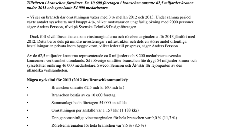 – Vi ser en bransch där omsättningen växer med 3 % mellan 2012 och 2013. Under samma period växte antalet sysselsatta med knappt 4 %, vilket motsvarar en ungefärlig ökning med 2000 personer, säger Anders Persson, tf vd på Svenska Teknik&Designföretagen.