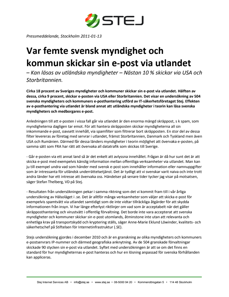 Cirka 18 procent av Sveriges myndigheter och kommuner skickar sin e-post via utlandet. Hälften av dessa, cirka 9 procent, skickar e-posten via USA eller Storbritannien. Det visar en undersökning av 504 svenska myndigheters och kommuners e-posthantering utförd av IT-säkerhetsföretaget Stej.
