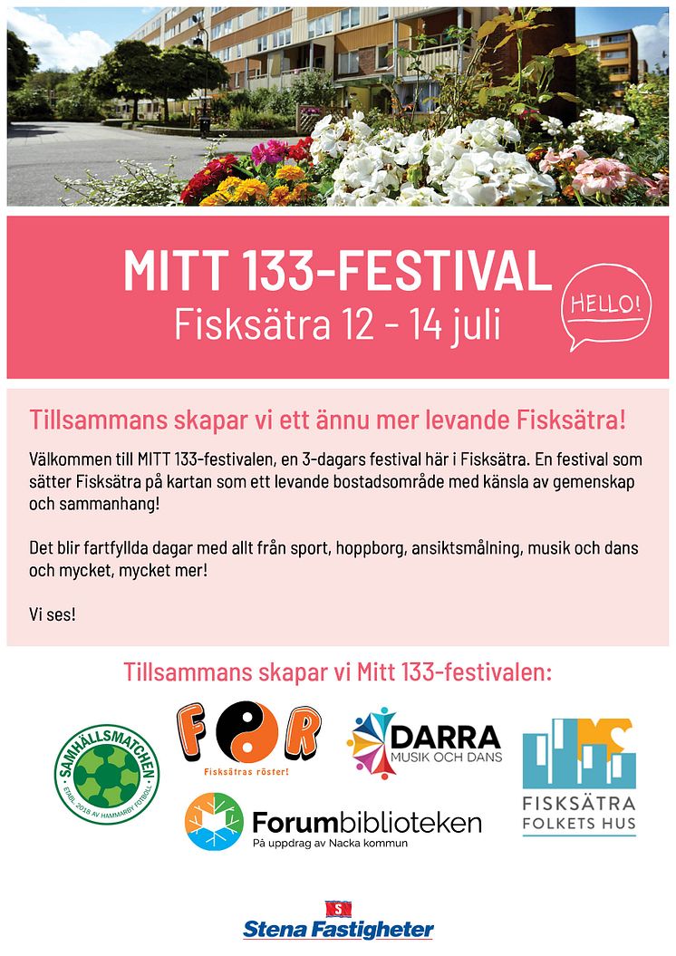 Det är viktigt att det finns meningsfulla aktiviteter och saker att göra i våra bostadsområden, året runt, men särskilt under sommaren när många är lediga. I Fisksätra skapar Stena Fastigheter nu MITT 133-festivalen. Vi gör det för att skapa en stolthet och samhörighet i Fisksätra, samtidigt som det ger möjlighet att visa det rika kultur- och föreningslivet.