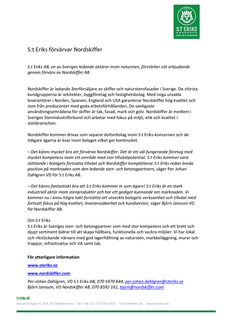 S:t Eriks AB, en av Sveriges ledande aktörer inom natursten, förstärker sitt erbjudande genom förvärv av Nordskiffer AB.